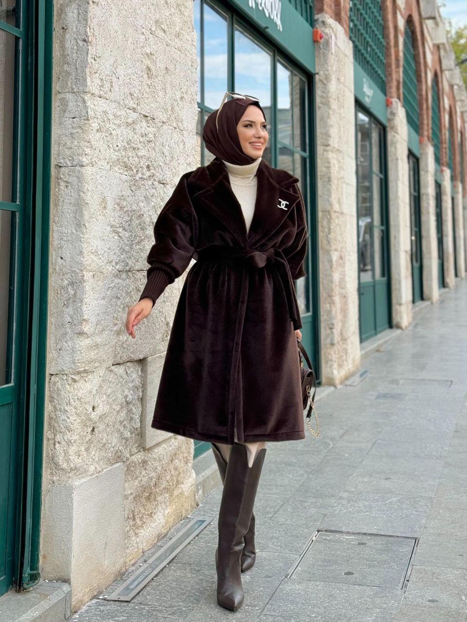 BEL KUŞAKLI YAKA TAŞ BRONŞ DETAYLI KABAN: