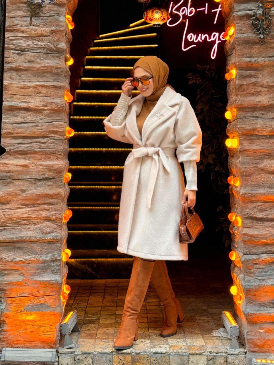 BEL KUŞAKLI YAKA TAŞ BRONŞ DETAYLI KABAN: